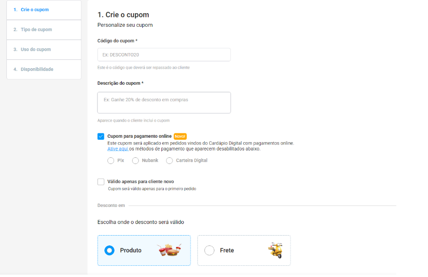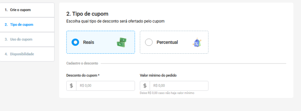 Nesta etapa, você define as configurações iniciais do cupom: