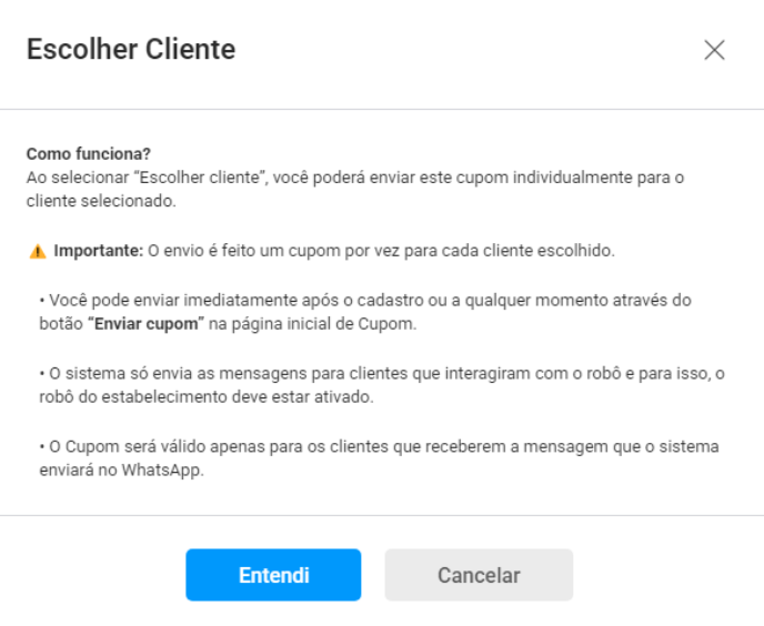 - Selecione: O cupom criado e o cliente que receberá o cupom via WhatsApp