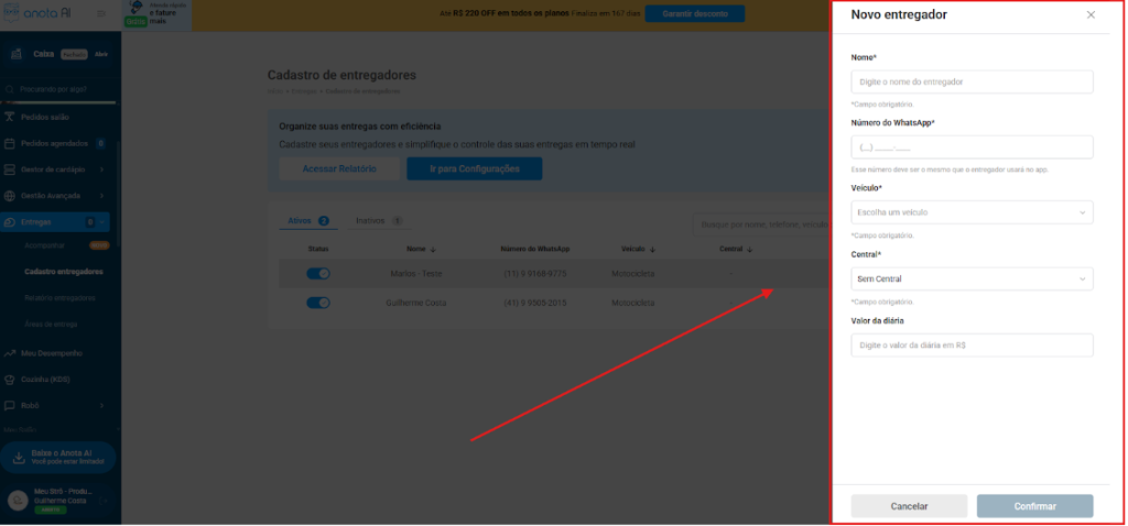 - Ir em “Entregas” → “Cadastro de entregadores” → “Cadastrar” → “+ Entregador”
