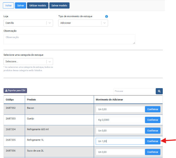 Ex: se você recebeu 5 unidades de bacon, digite 5,00. - Depois de digitar a quantidade, clique no botão Confirmar à direita para registrar esse item no ajuste.