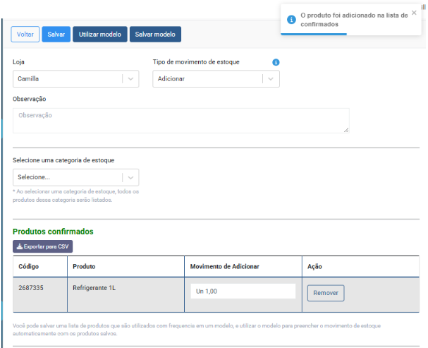 Salvar modelo: Depois de preencher um ajuste (entrada, saída ou inventário), você pode salvar esse preenchimento como um modelo pronto.