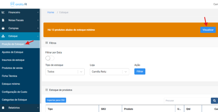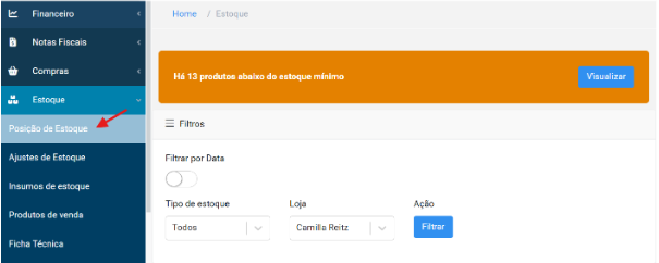 Você pode fazer várias alterações de estoque mínimo e só salvar tudo de uma vez no final, assim você economiza tempo. Agora você será alertado pela tela Estoque > Posição de Estoque sempre que o produto estiver chegando ao fim — e poderá se organizar antes de faltar algo no seu estoque. Clique em Visualizar para conferir os itens que estão abaixo do estoque mínimo.
