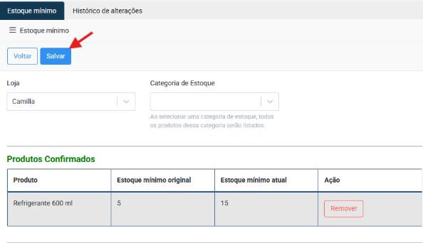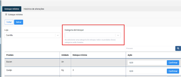 Depois que você define o estoque mínimo de um produto e clica em Confirmar, ele aparece nesta parte da tela, chamada Produtos Confirmados.