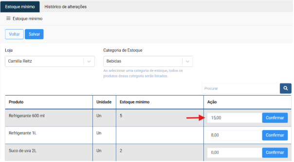 - No coluna Ação, digite a quantidade mínima que você quer manter desse produto no seu estoque.