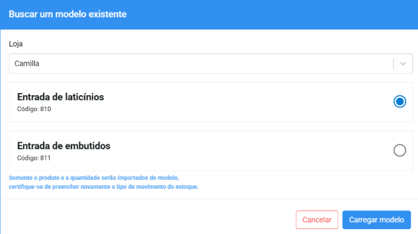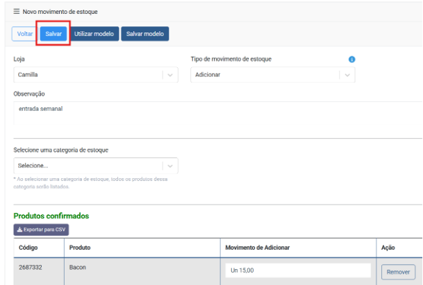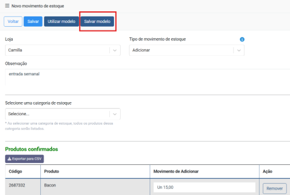 Vamos supor que todo mês você dá entrada nos mesmos produtos da sua reposição principal com o mesmo tipo de movimento. Em vez de montar esse ajuste do zero todo mês, você pode preencher uma vez e salvar como modelo.