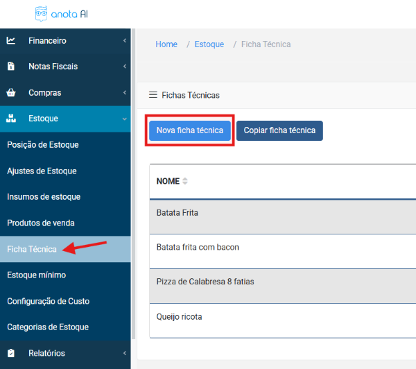 - Vá em Estoque > Ficha Técnica > Nova ficha técnica.