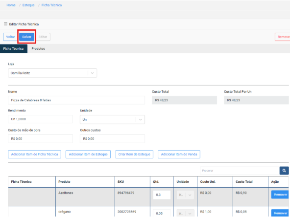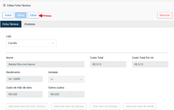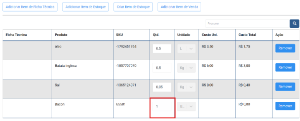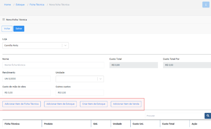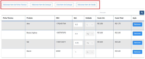 Observação: Caso seja criado uma nova ficha técnica que utilize os mesmos itens para a composição do lanche, basta clicar em “Adicionar Item de Estoque” não é necessário criar o mesmo item, visto que ele já está no estoque.