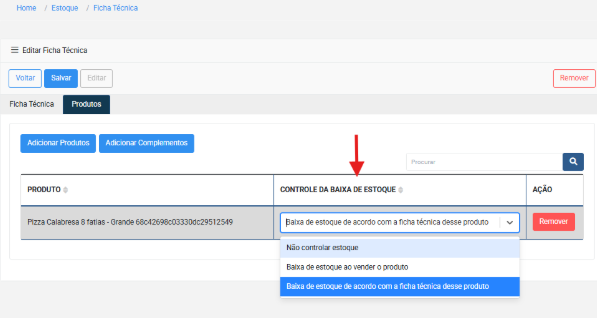 Na tela de edição adicione a Ficha técnica criada. Na opção Como deseja controlar a baixa de estoque? Selecione Baixa de estoque de acordo com a ficha técnica desse produto.
