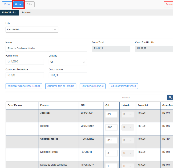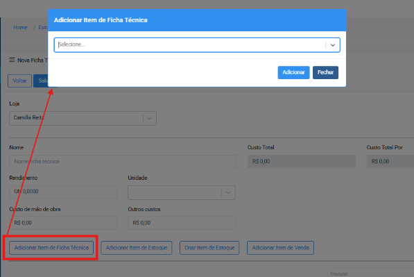 - Adicionar Item de Ficha Técnica = ingrediente já cadastrado no estoque.