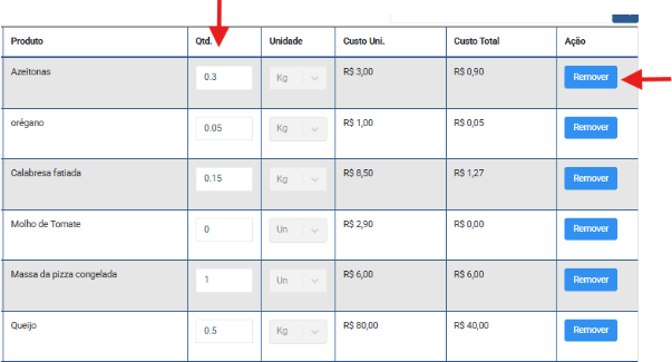 Cada ingrediente incluído (ex.: mussarela, calabresa, azeitona, orégano) já tem um custo unitário definido no estoque.