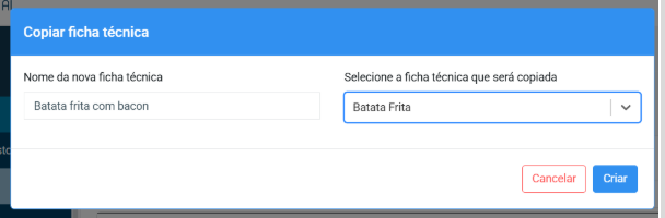 2. Informe o Nome da nova ficha técnica e Selecione a ficha técnica que será copiada.