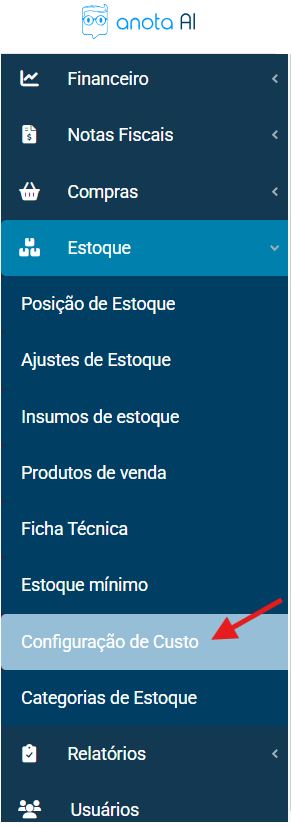 2. Em seguida clique em “Estoque > Configurações de custos“