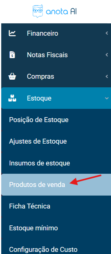 No menu Estoque > Produtos de Venda serão listados todos os itens do cardápio.