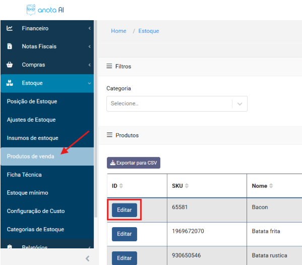 Agora é necessário vincular essa ficha técnica a um produto de venda, no menu lateral esquerdo clique em “Estoque > Produtos de Venda” encontre o item e clique no botão “Editar“.