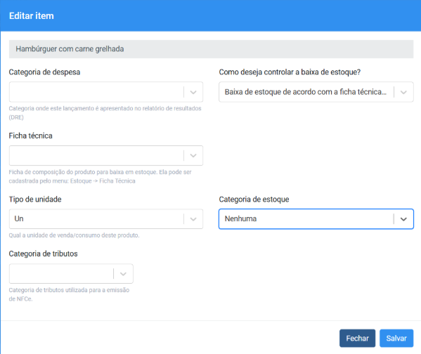 Todos os itens do cardápio iniciam como um “Produto de Venda“, ou seja, não têm controle de estoque. Para que seja possível controlar o estoque de algum item, é necessário adicionar uma categoria de estoque e a como deseja controlar a ele.