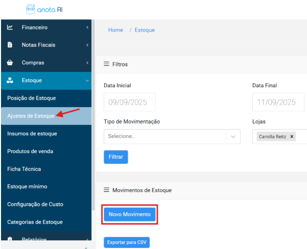 No menu lateral esquerdo Estoque > Ajustes de Estoque clique em Novo Movimento