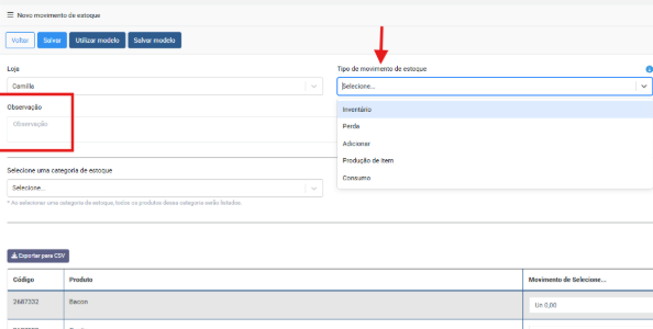 - Preencha todas as informações do movimento (Loja, Tipo de movimento de estoque e Observação)