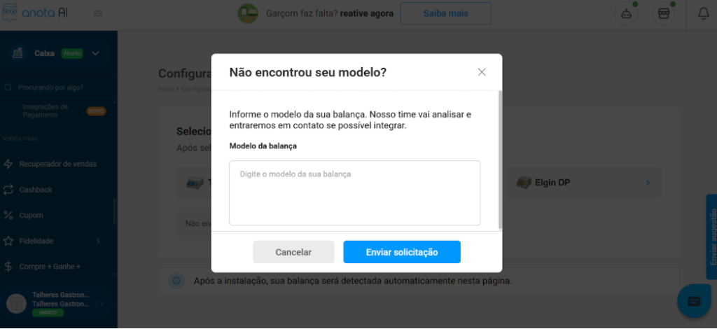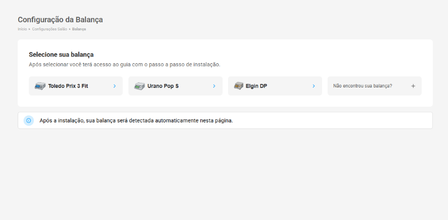 Caso o usuário possua um modelo de balança que não está na lista de balanças recomendadas, é possível solicitar a integração do modelo específico ao sistema.