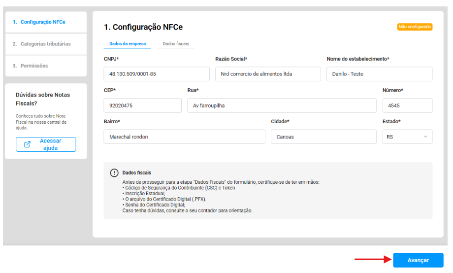 Com os dados fiscais em mãos, clique em Avançar.