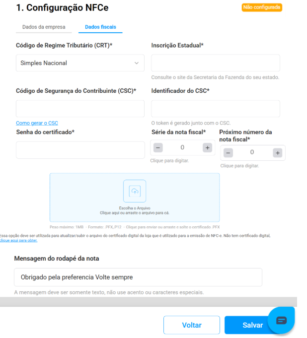 Nesta seção, você deverá inserir os dados fiscais de sua loja, os quais são imprescindíveis para a correta emissão da NFC-e. Preencha todos os campos exatamente conforme o seu registro junto à SEFAZ.