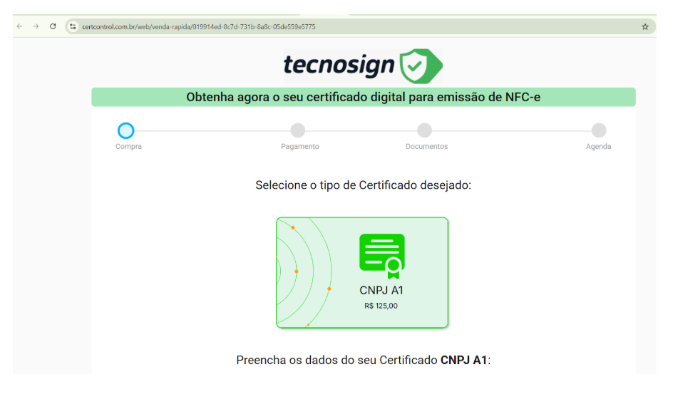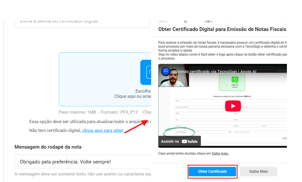 Para clientes sem certificado digital, uma mensagem “Não tem certificado digital, Clique aqui para obter” será exibida, abrindo um pop-up explicativo sobre a parceria exclusiva com a TecnoSign.