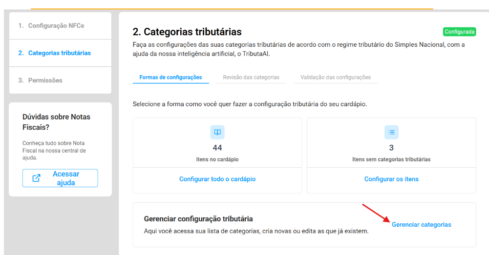 Como configurar categorias tributárias com IA