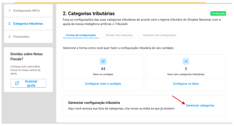 No admin anota.ai, acesse Configuração > Nota Fiscal > Categoria Tributária.
