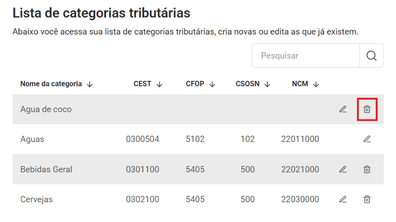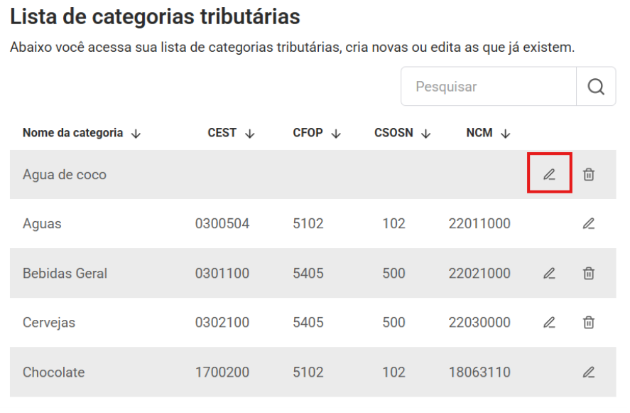 Aparecerá a lista de categorias já cadastradas. Para editar, você deve clicar no ícone de edição.