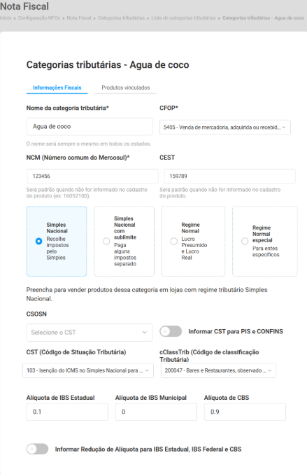 Nesta tela você pode editar as informações fiscais de uma categoria tributária, garantindo que os impostos sejam aplicados corretamente na emissão das notas fiscais.