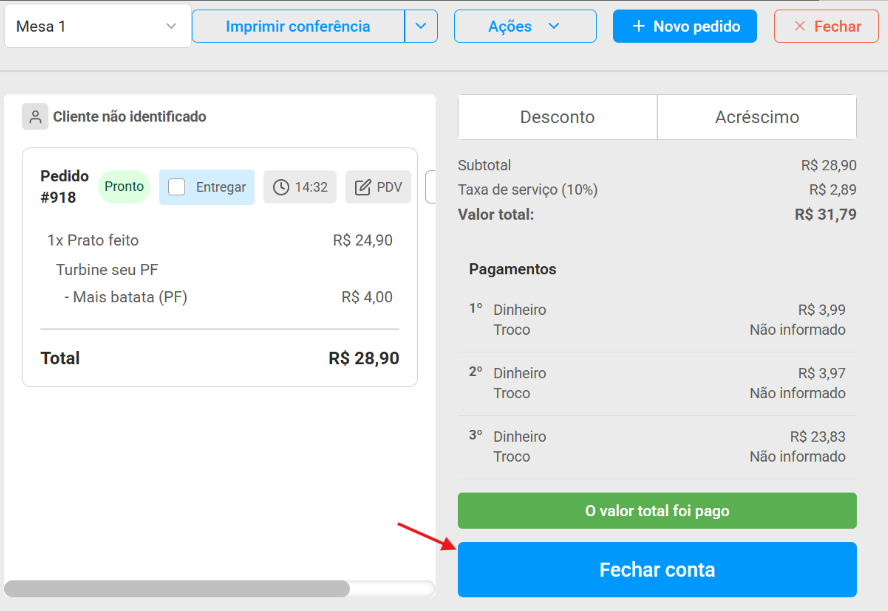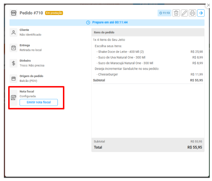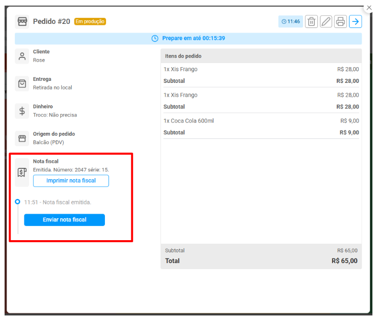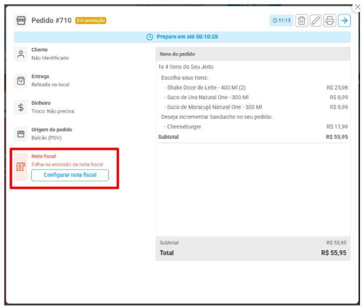 O pedido fica salvo no sistema e a nota é reenviada automaticamente assim que a conexão volta.