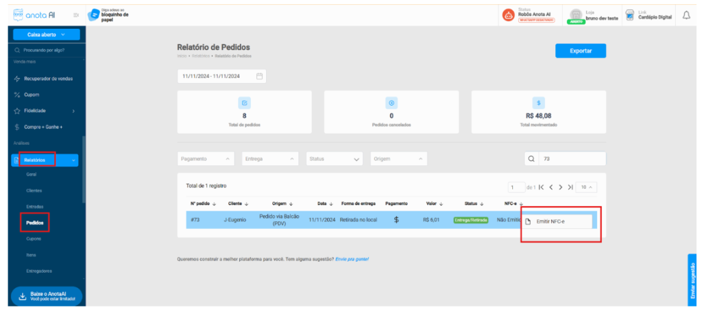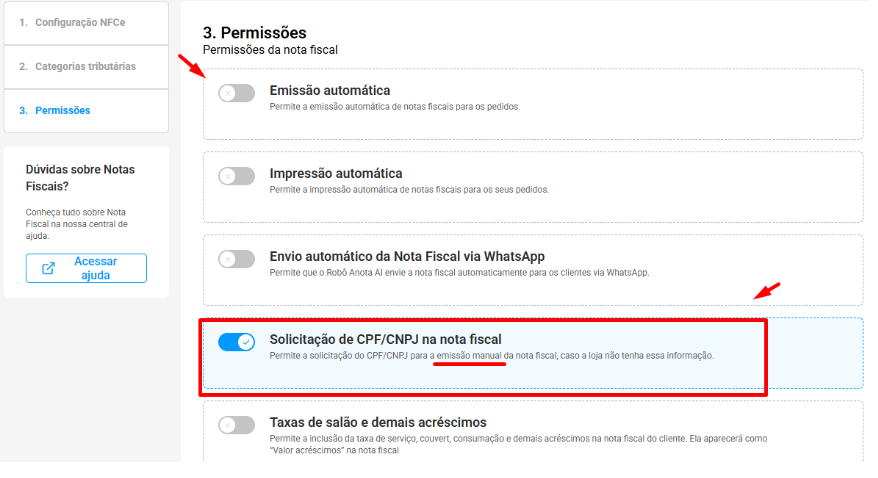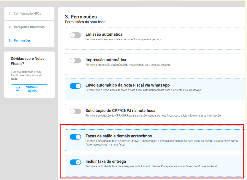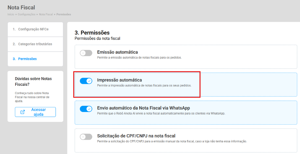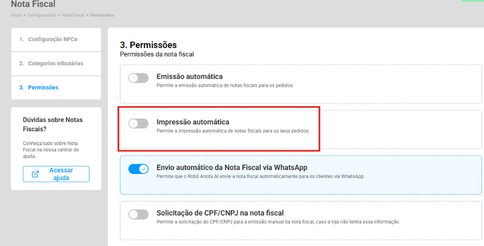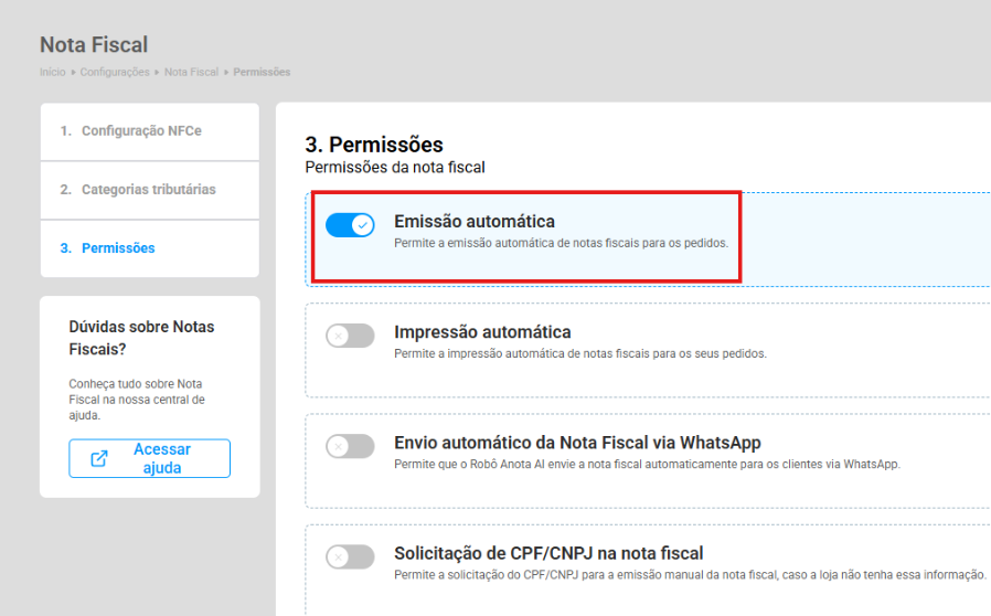 No Admin Anota.ai, acesse Configuração no menu lateral e selecione a opção Nota Fiscal.