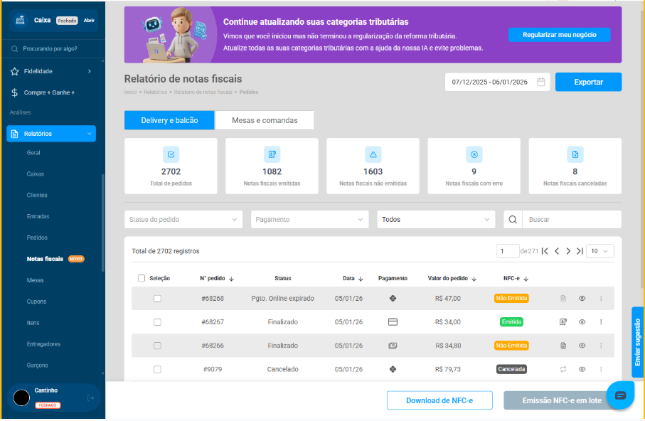 - Na inclusão de novos produtos Quando adicionar novos itens ao menu no futuro. Como configurar categorias tributárias com IA