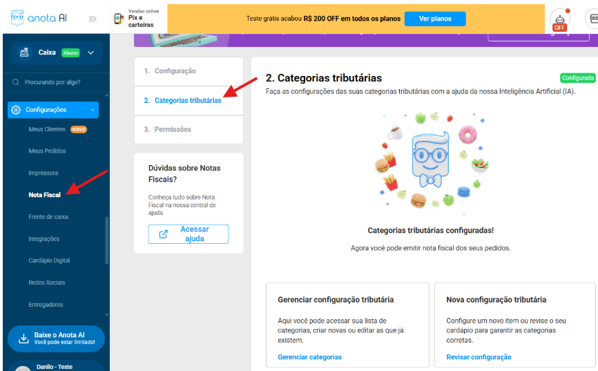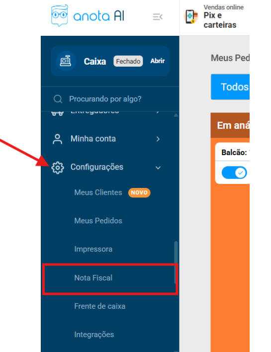 No Admin Anota.ai, acesse Configuração no menu lateral e selecione a opção Nota Fiscal.