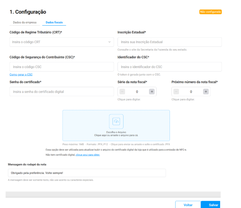 É a identidade digital da sua empresa. Ele garante a validade jurídica da nota e precisa estar válido e cadastrado no sistema para que a NFC-e seja emitida.