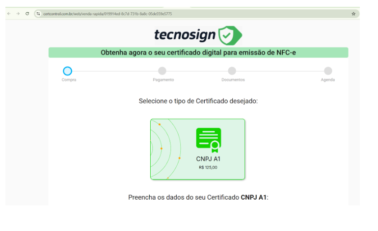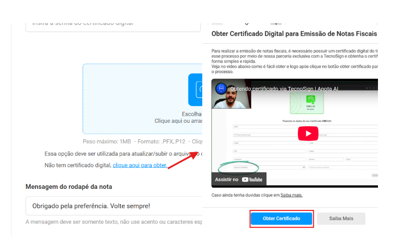 Para clientes sem certificado digital, uma mensagem “Não tem certificado digital, Clique aqui para obter” será exibida, abrindo um pop-up explicativo sobre a parceria exclusiva com a TecnoSign.