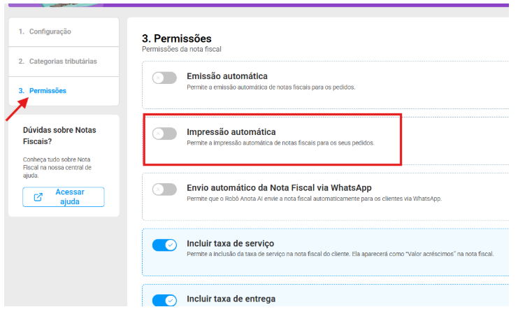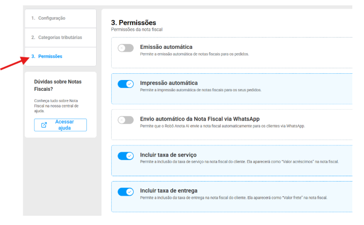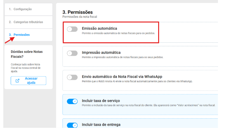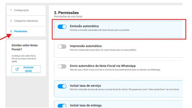 Na opção Permissões no menu, você poderá confugurar como será a emissão de notas: manual ou automática. Mais informações sobre os tipos de emissão, clique aqui.