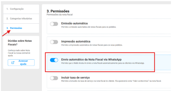 Esta opção permite que o Robô Anota AI envie a nota fiscal automaticamente para os clientes via WhatsApp.