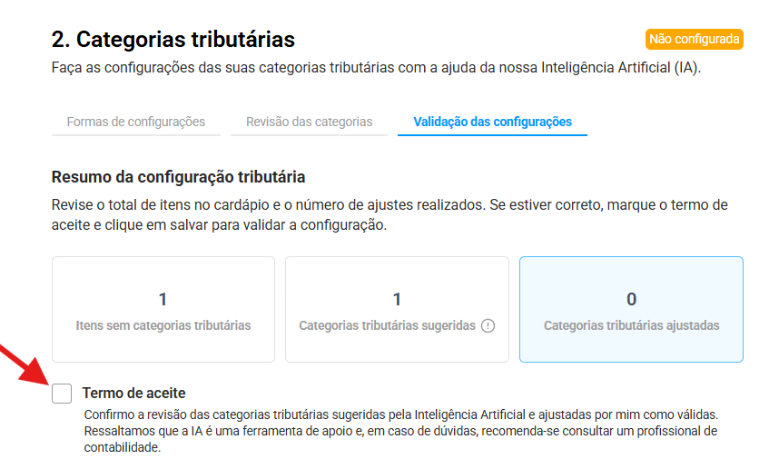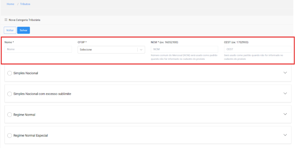 - Preencha a categoria de tributos com a informação fornecida pelo contador.