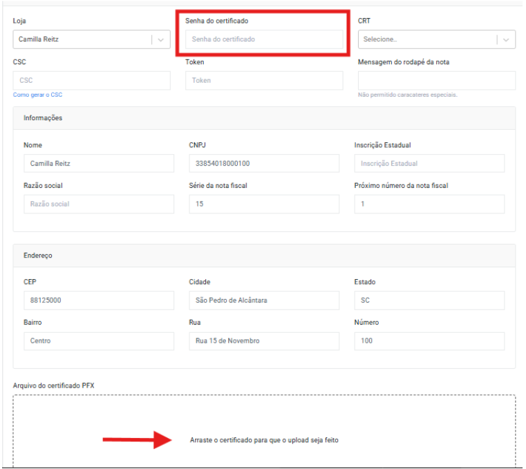 Adicione o certificado digital no formato .PFX e, em seguida, insira a senha correspondente.