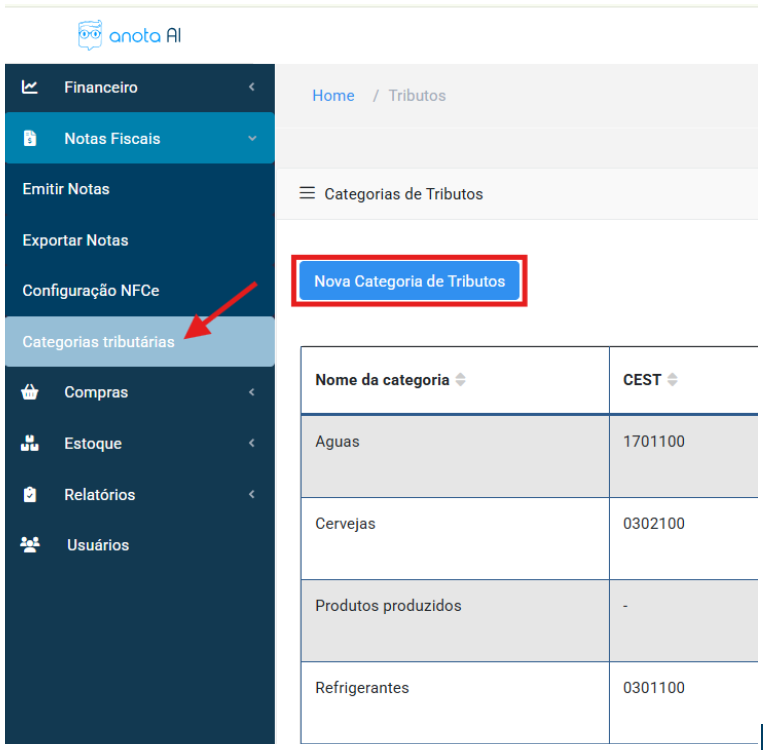Acesse Notas Fiscais > Categorias Tributárias , dentro desta página clique no botão Nova Categoria de tributos.