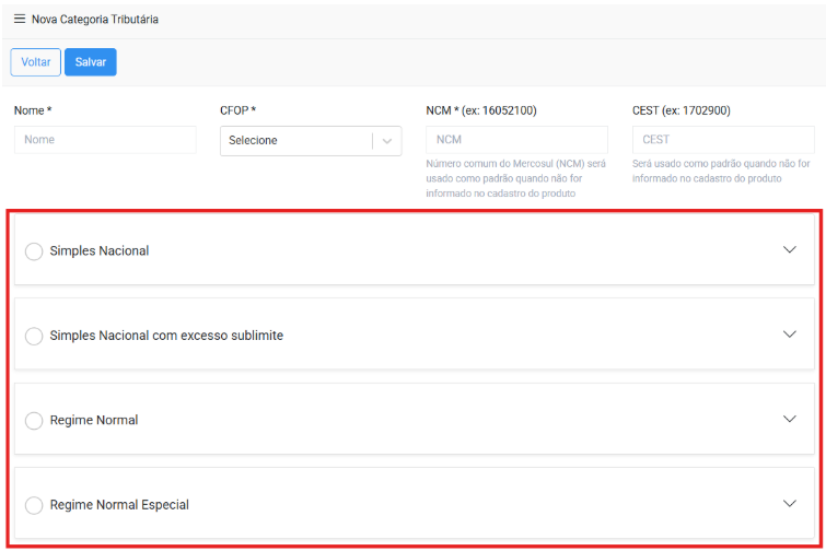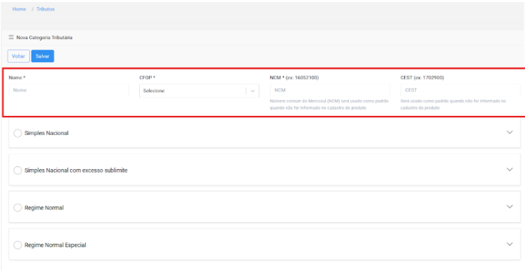 - Na página de Nova Categoria de tributos cadastre os dados tributários: