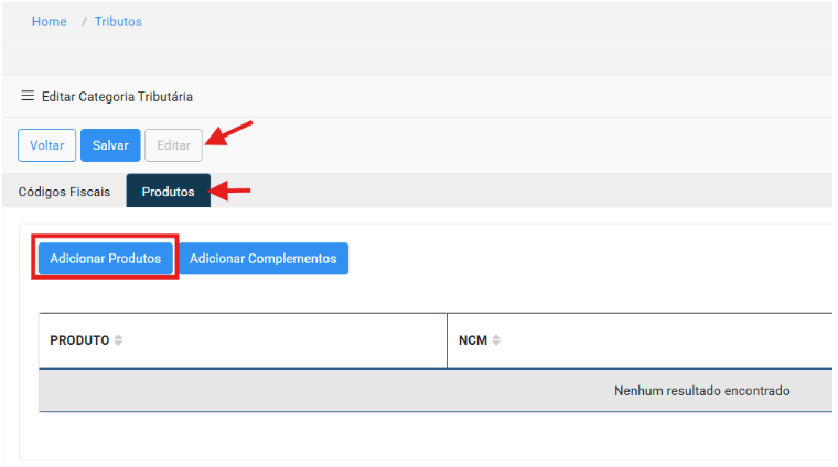 Agora, você poderá então associar os produtos a essa categoria tributária, clicando em Editar, depois em Produtos e, por fim, em Adicionar Produtos.
