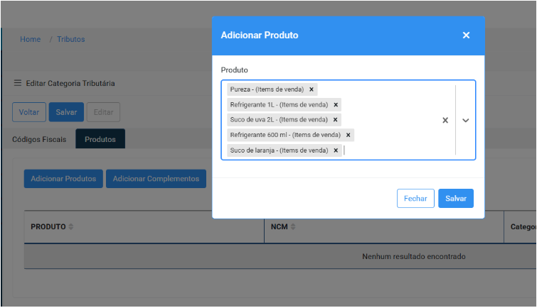 Selecione um ou mais produtos que deseja vincular a essa categoria tributária e clique em Salvar.