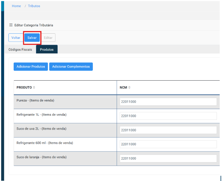 Após adicionar os itens clique em Salvar na tela e pronto Categoria de tributos e produtos estão vinculados.