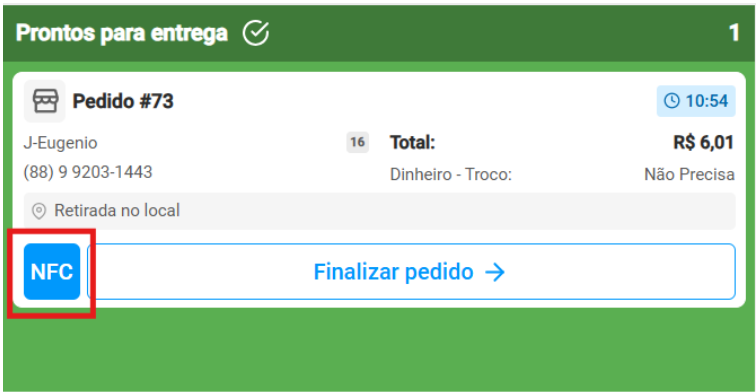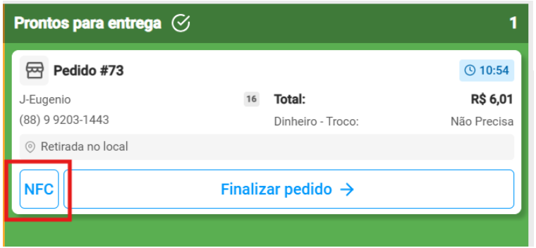 Com isso, quando o pedido avançar para a coluna “Prontos para entrega” o botão de gerar a nota fiscal, NFC, irá aparecer.