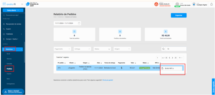 - Para ver a nota emitida nesse modo, acesse Relatórios → Pedidos.