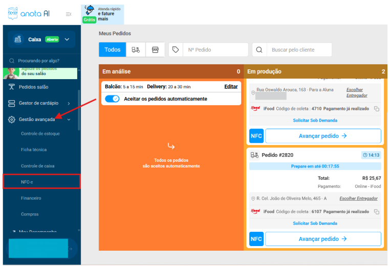 - No menu Gestor de pedidos Anota, vá até Gestão Avançada > NFCe.