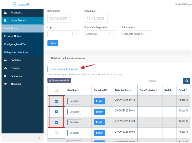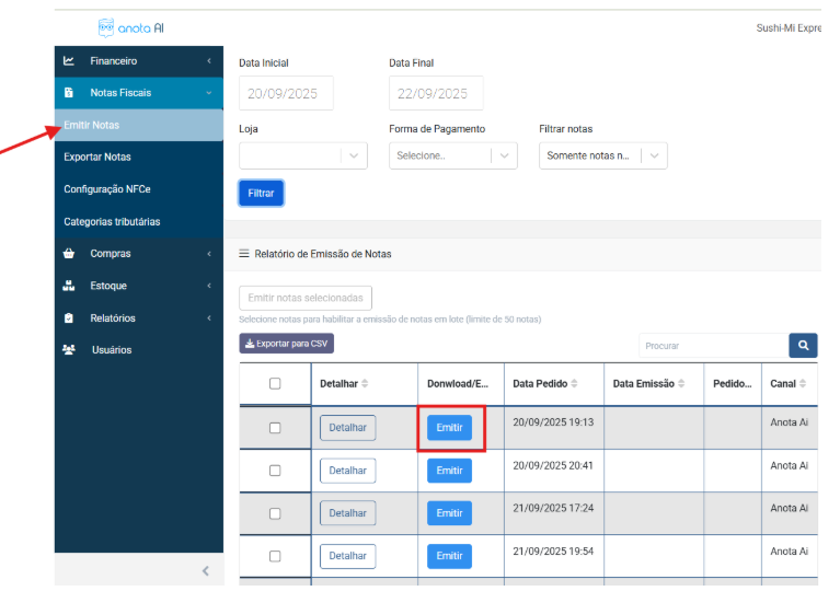 - Durante o mês, acompanhe as notas emitidas em Notas Fiscais > Emitir Notas.