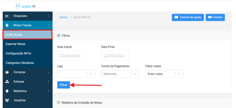 - Utilize os filtros de data inicial, data final, loja, forma de pagamento ou status da nota para refinar a busca.